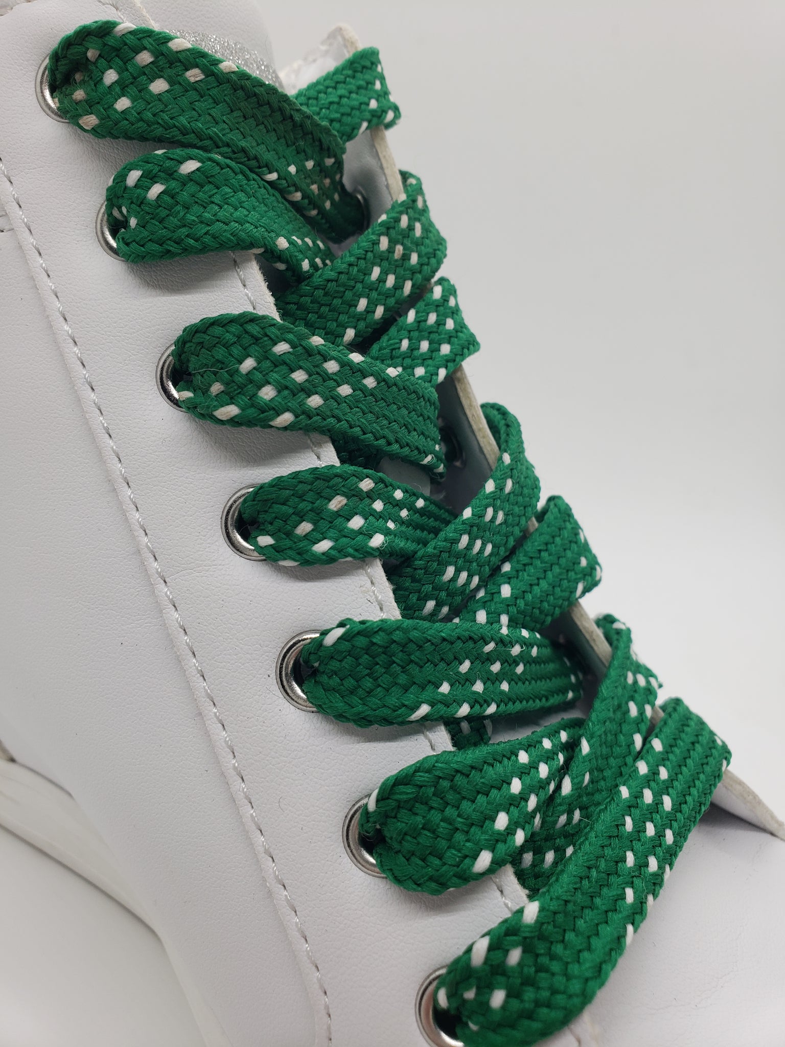 Premium grade Green Sport laces with White accents. These high quality laces will look great on your shoes. Show off your team colors or just find the perfect look for your favorite shoes. These laces are flat and approximately ½” wide.