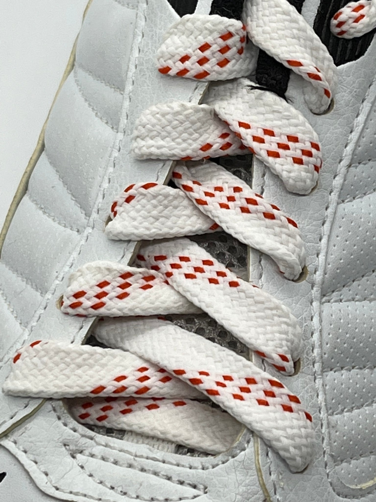 Premium grade White Sport laces with Orange accents. These high quality laces will look great on your shoes. Show off your team colors or just find the perfect look for your favorite shoes. These laces are flat and approximately ½” wide.