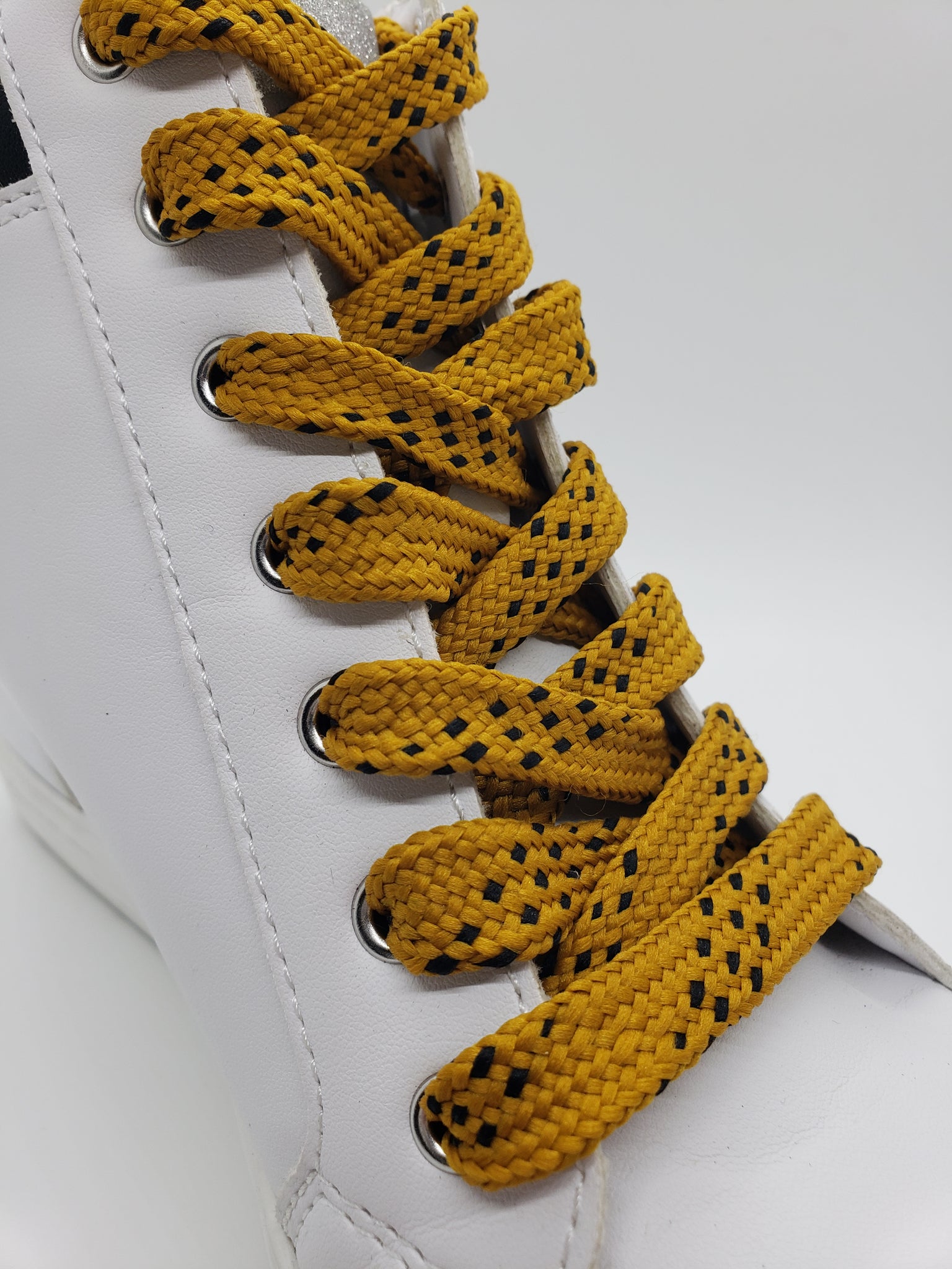 Premium grade Gold Sport laces with Black accents. These high quality laces will look great on your shoes. Show off your team colors or just find the perfect look for your favorite shoes. These laces are flat and approximately ½” wide.