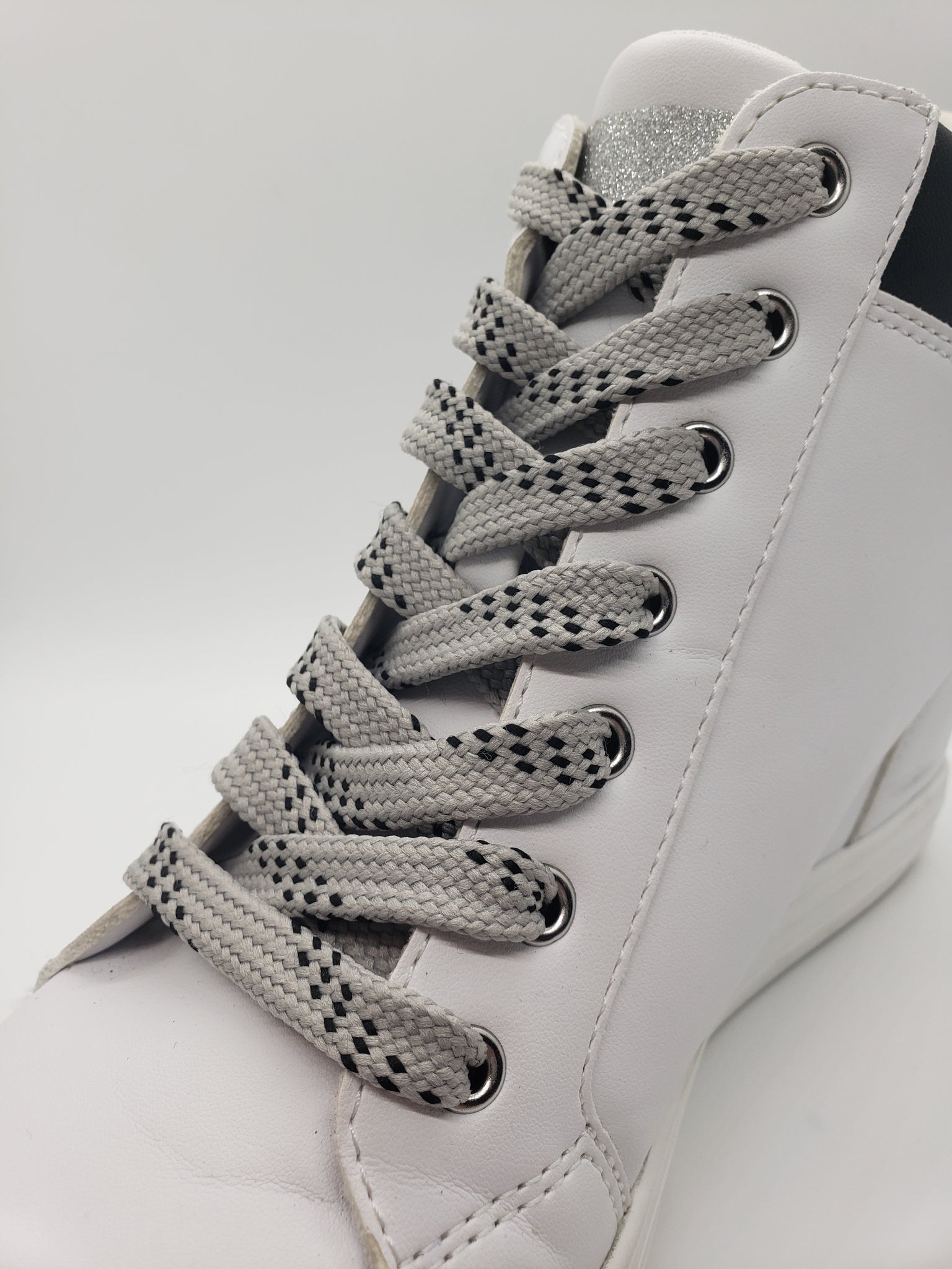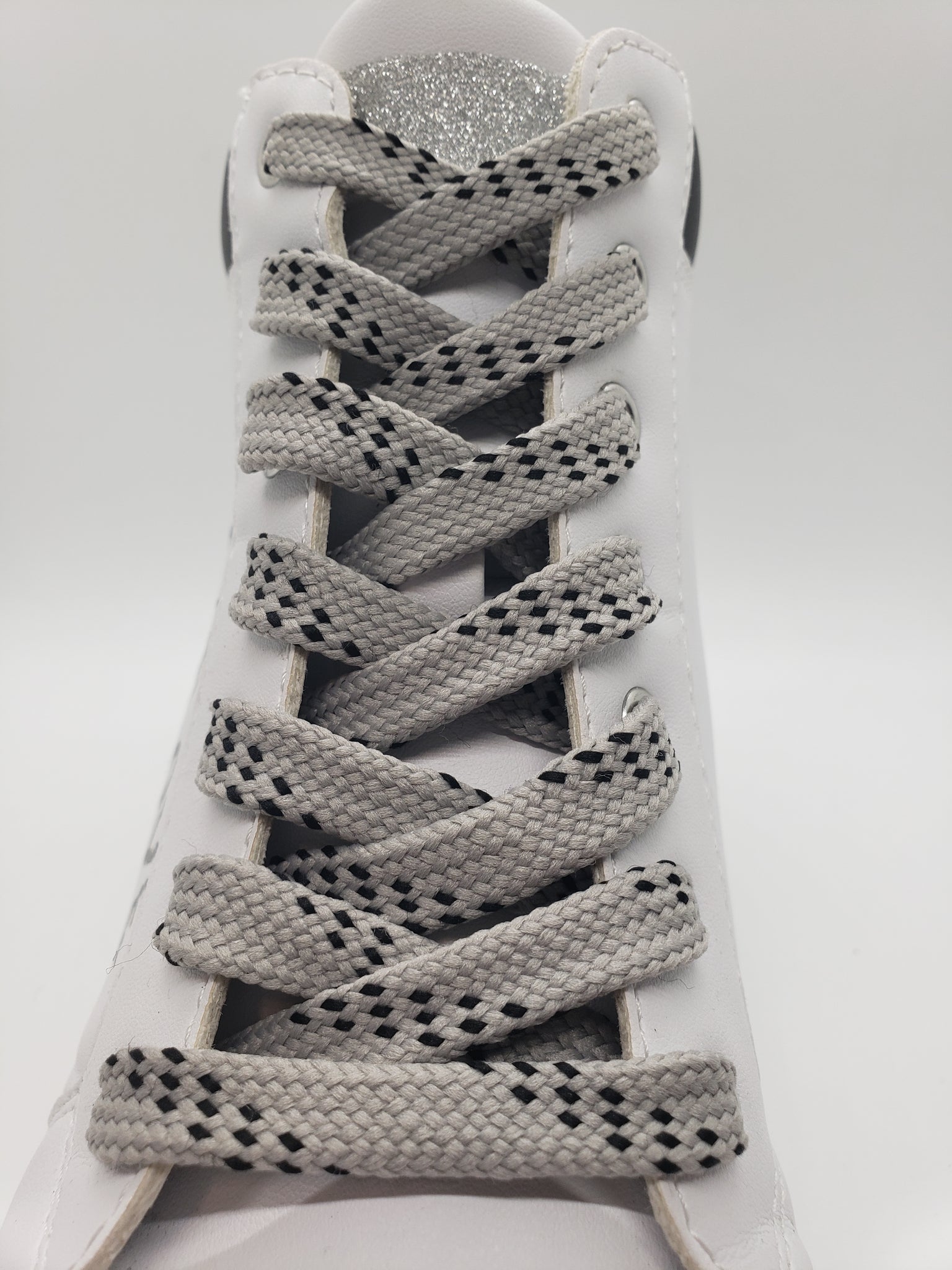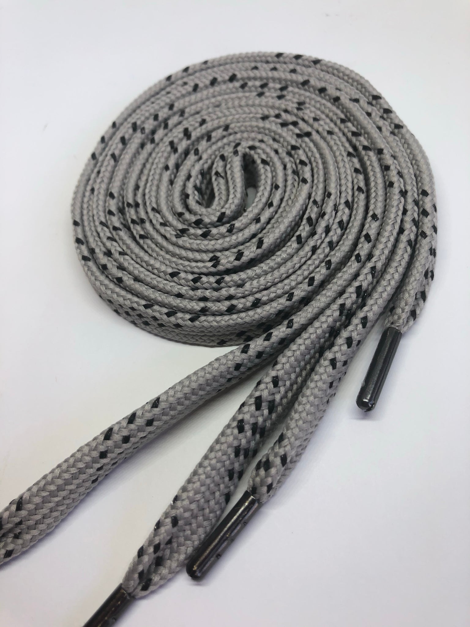 Premium grade Gray Sport laces with Black accents. These high quality laces will look great on your shoes. Show off your team colors or just find the perfect look for your favorite shoes. These laces are flat and approximately ½” wide.