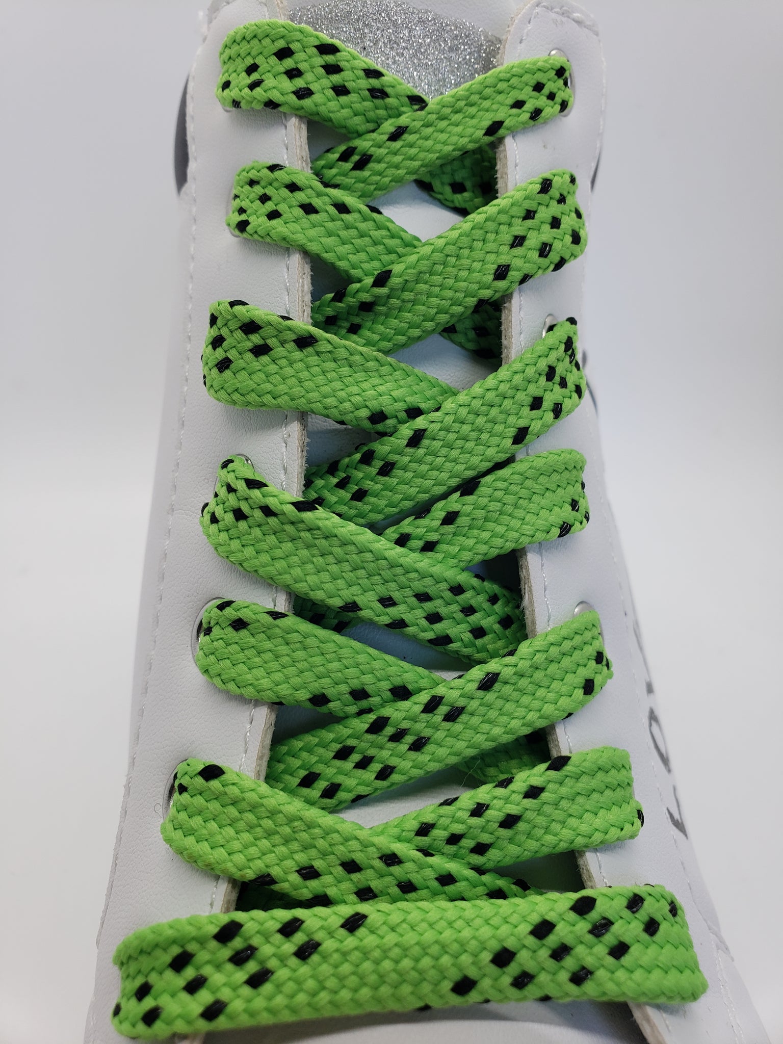 Premium grade Neon Green Sport laces with Black accents. These high quality laces will look great on your shoes. Show off your team colors or just find the perfect look for your favorite shoes. These laces are flat and approximately ½” wide.