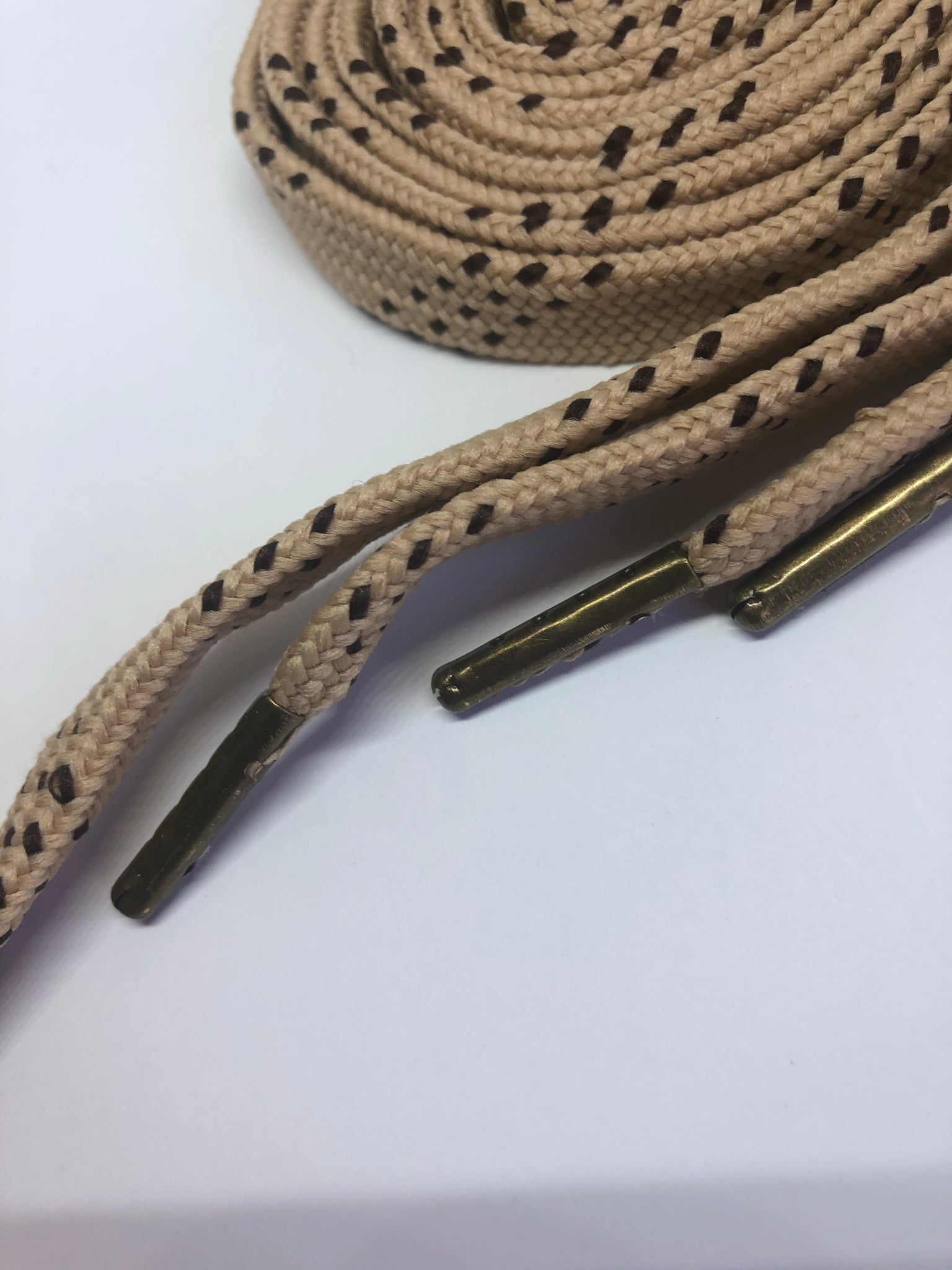 Premium grade Tan Sport laces with Brown accents. These high quality laces will look great on your shoes. Show off your team colors or just find the perfect look for your favorite shoes. These laces are flat and approximately ½” wide.