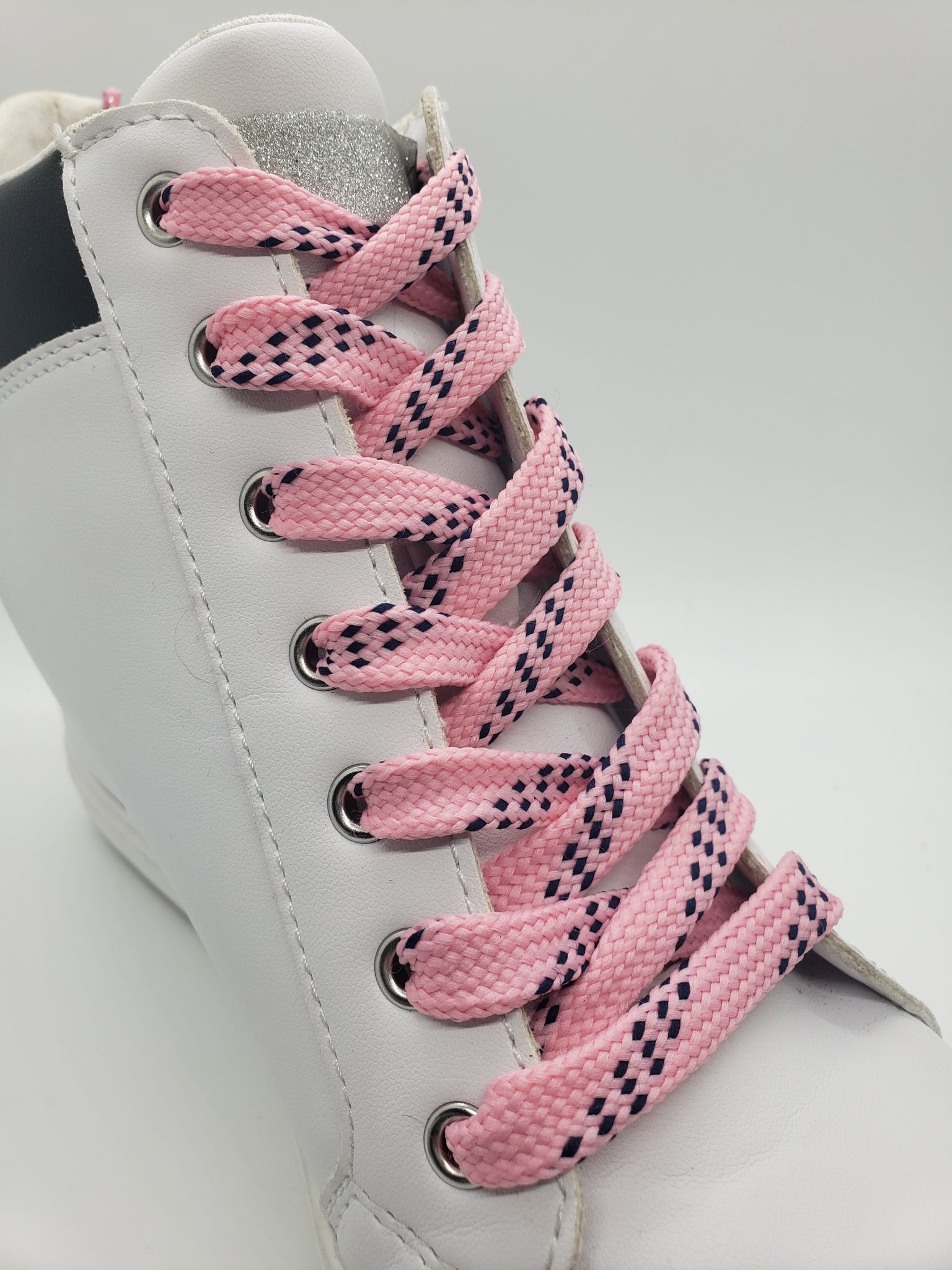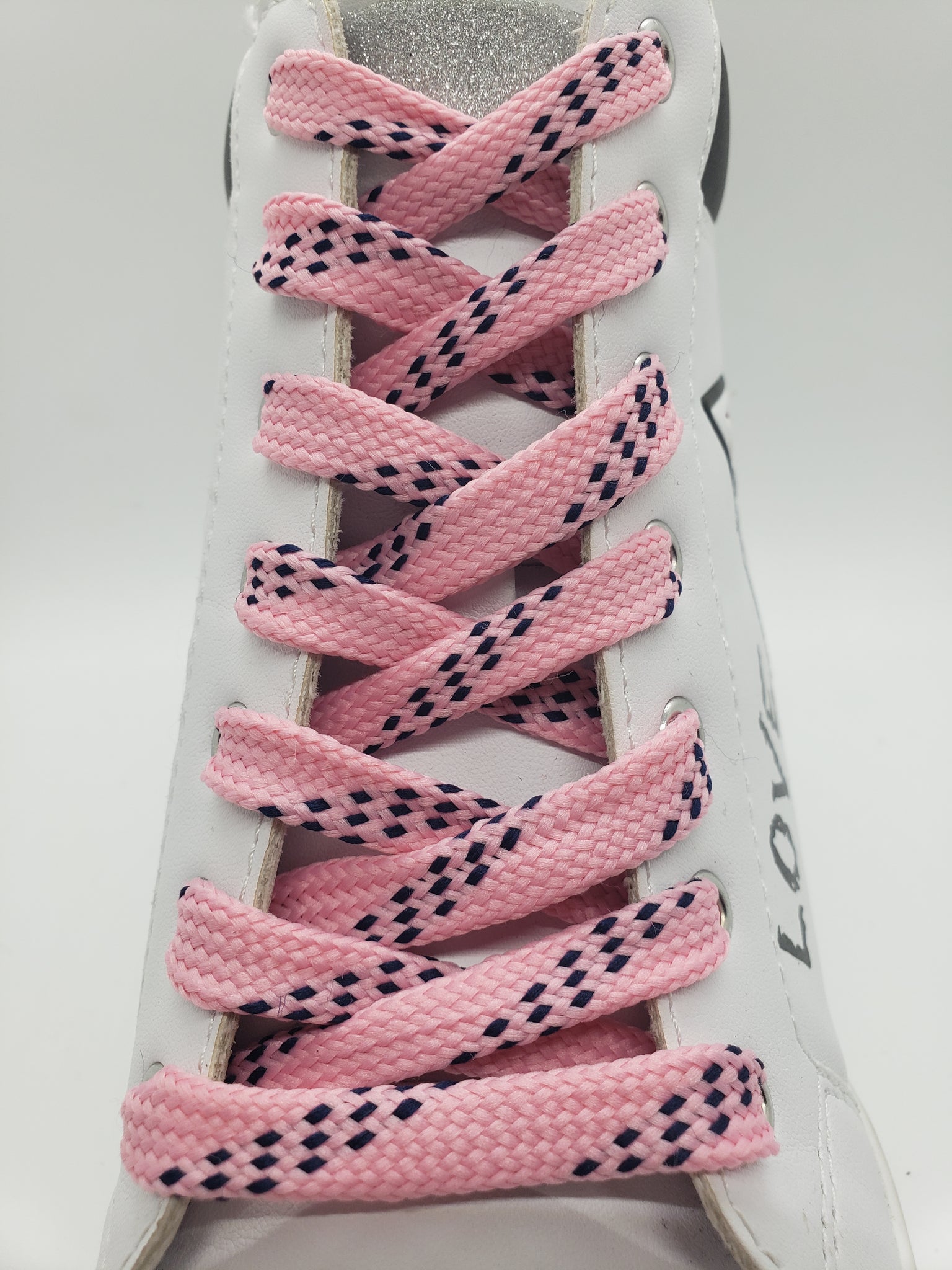 Premium grade pink Sport laces with navy accents. These high quality laces will look great on your shoes. Show off your team colors or just find the perfect look for your favorite shoes. These laces are flat and approximately ½” wide.