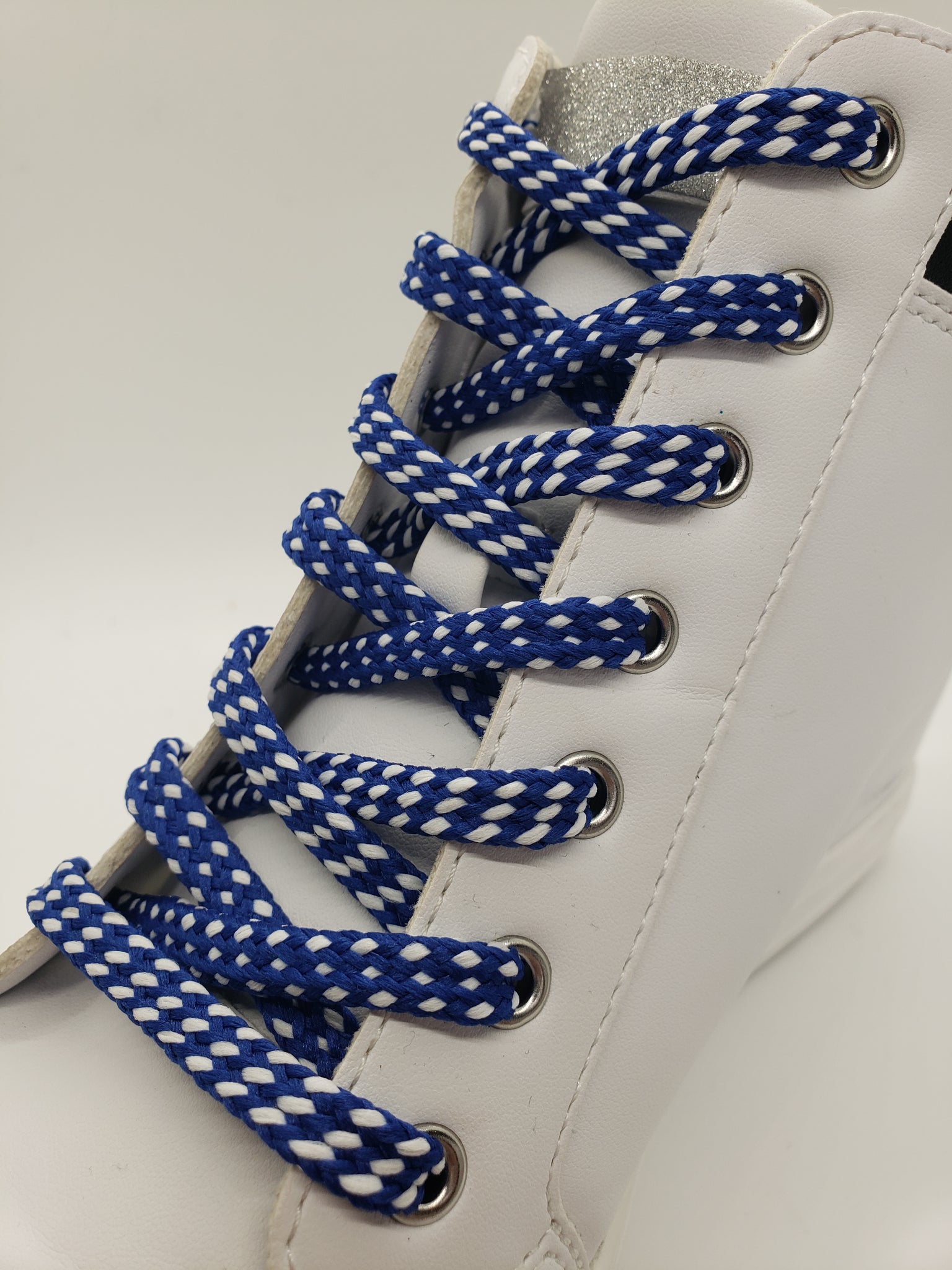 Blue and White Dotted shoelaces – a twist on a classic design that will make your shoes stand out. We call these shoelaces ‘hybrid’ because they are halfway between round and flat. This oval shaped lace is approximately 5/16” wide. Many colors are available but if you don’t see the combination you want feel free to reach out to us.