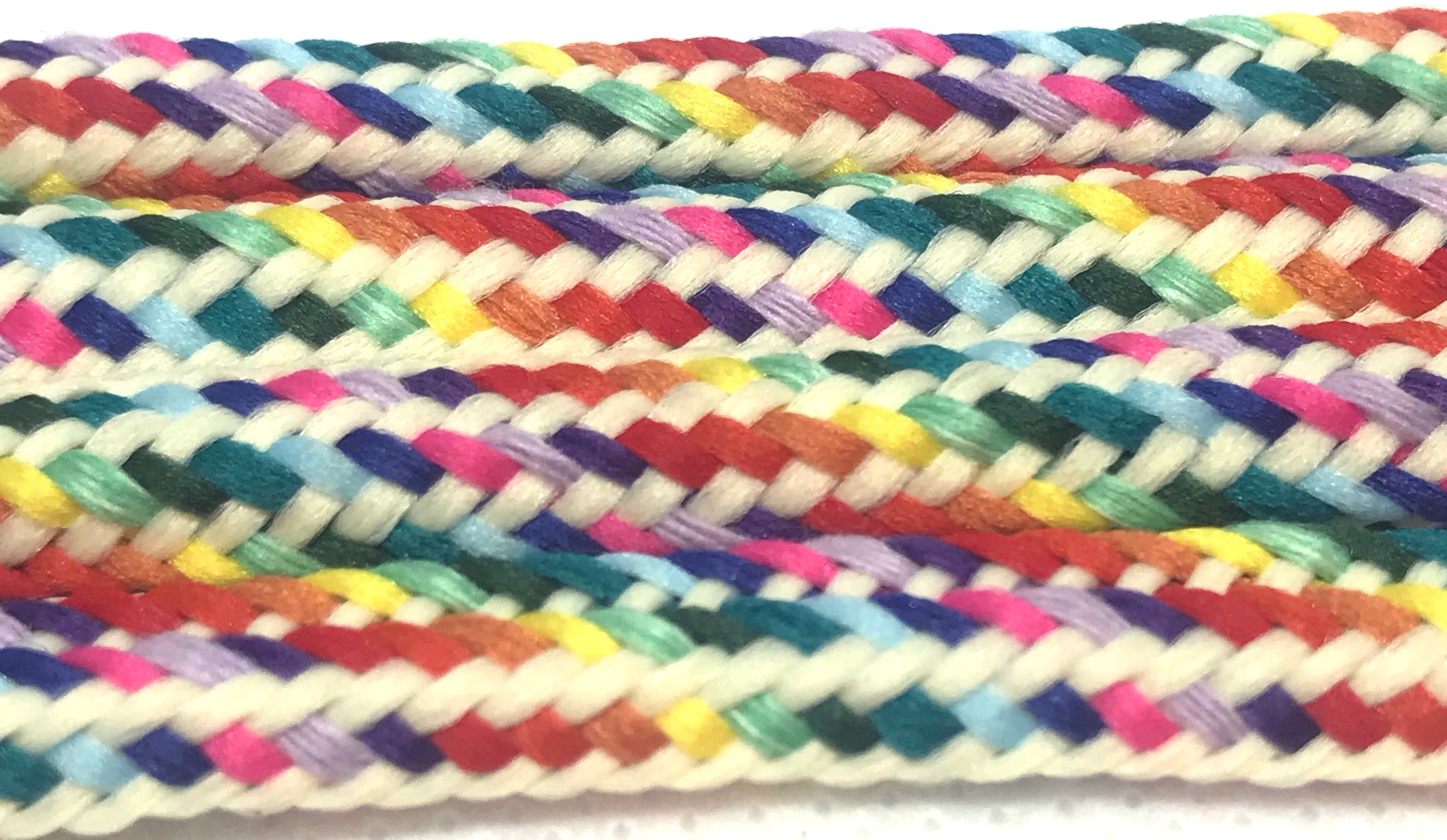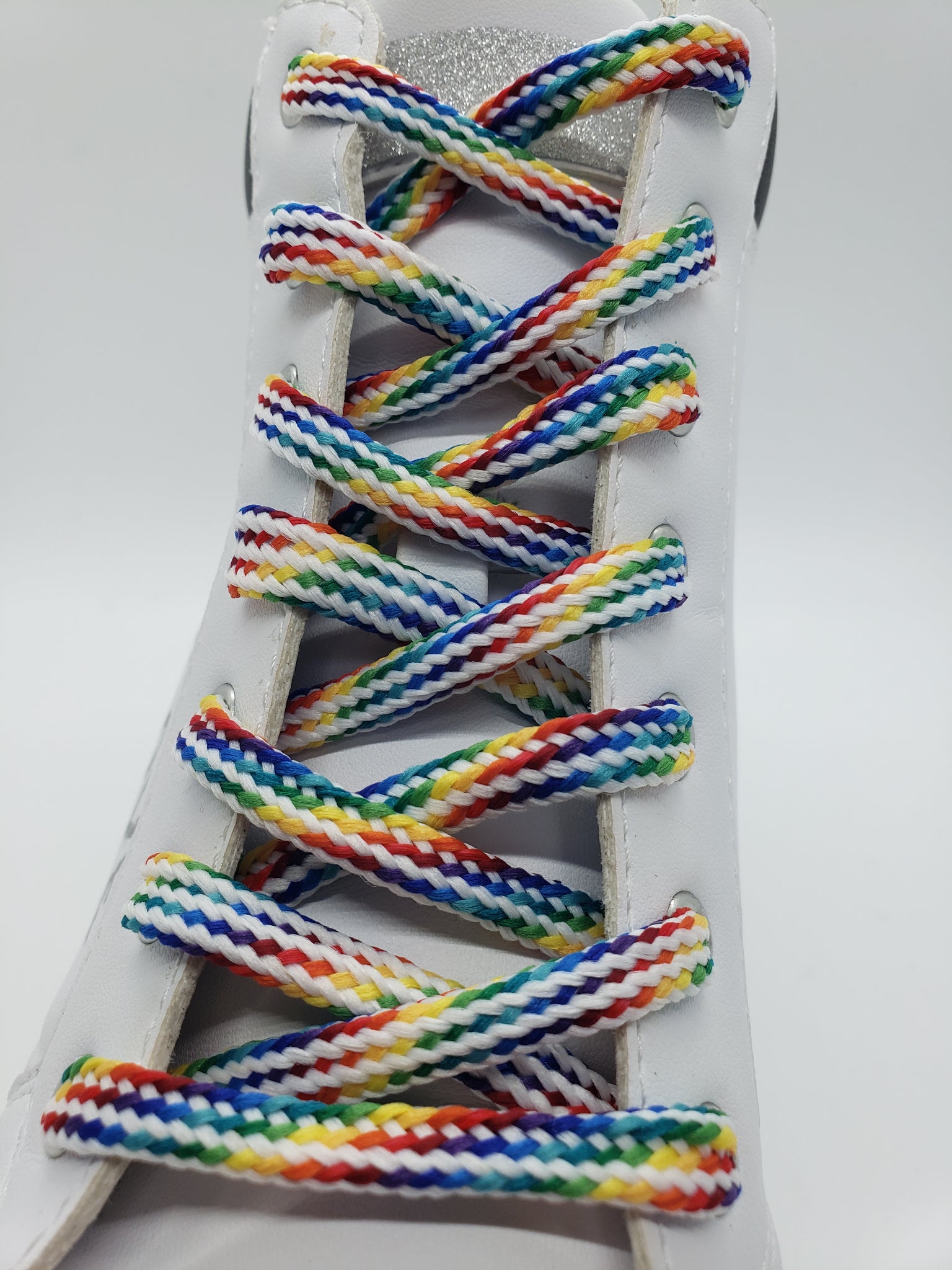 Rainbow laces on a white base. We call these shoelaces ‘hybrid’ because they are halfway between round and flat. This oval shaped lace is approximately 5/16” wide. Many colors are available but if you don’t see the combination you want feel free to reach out to us.
