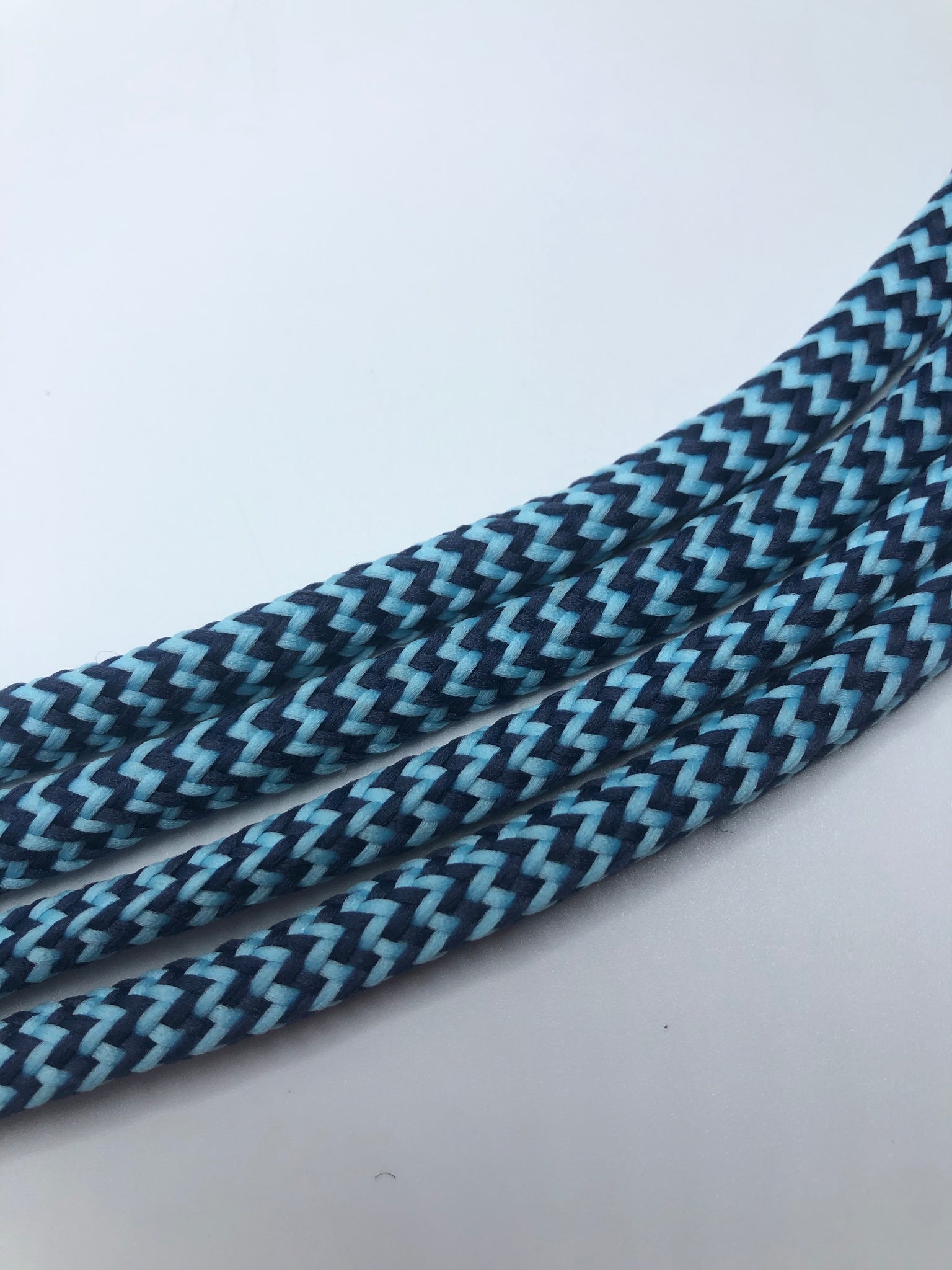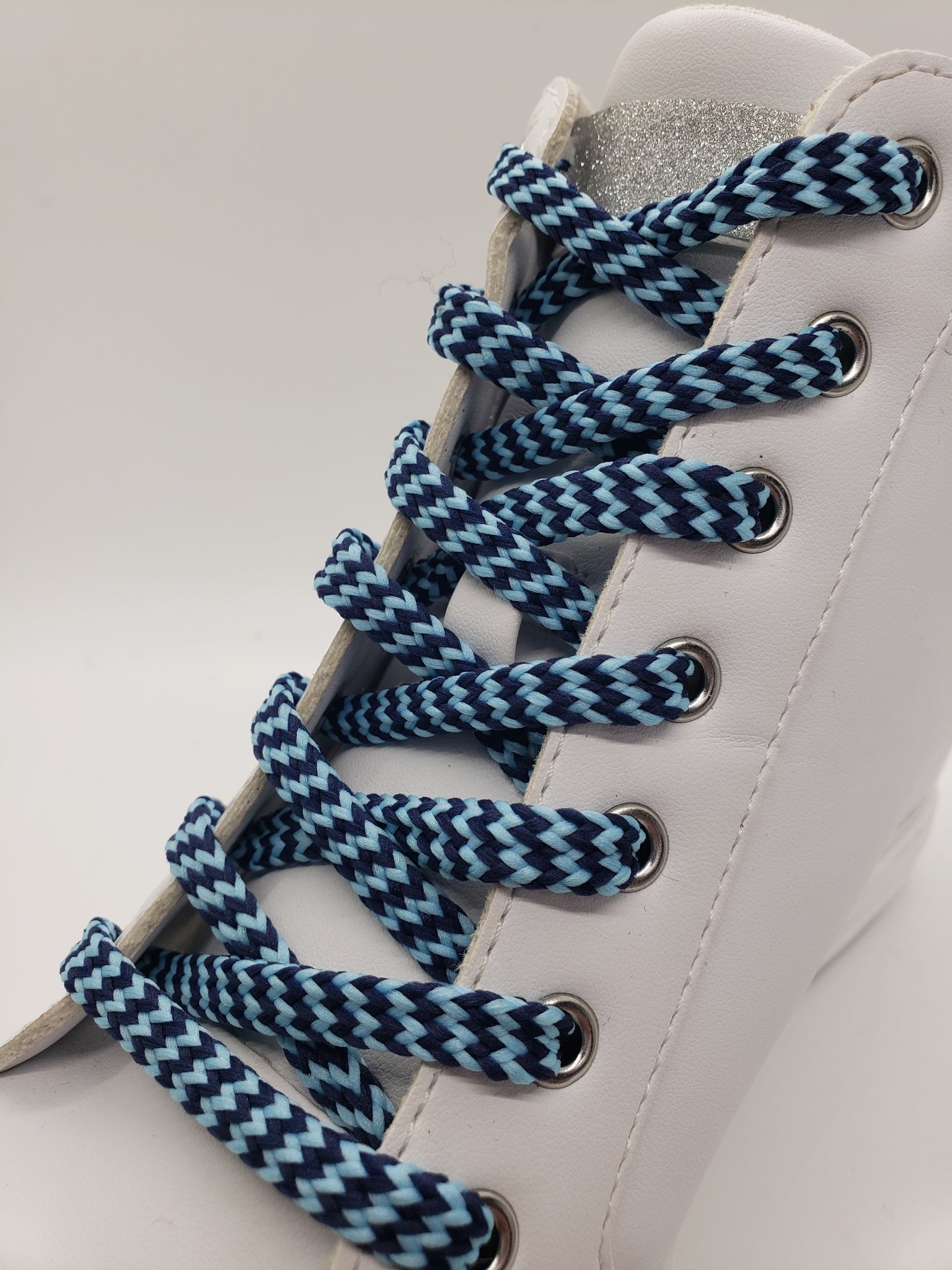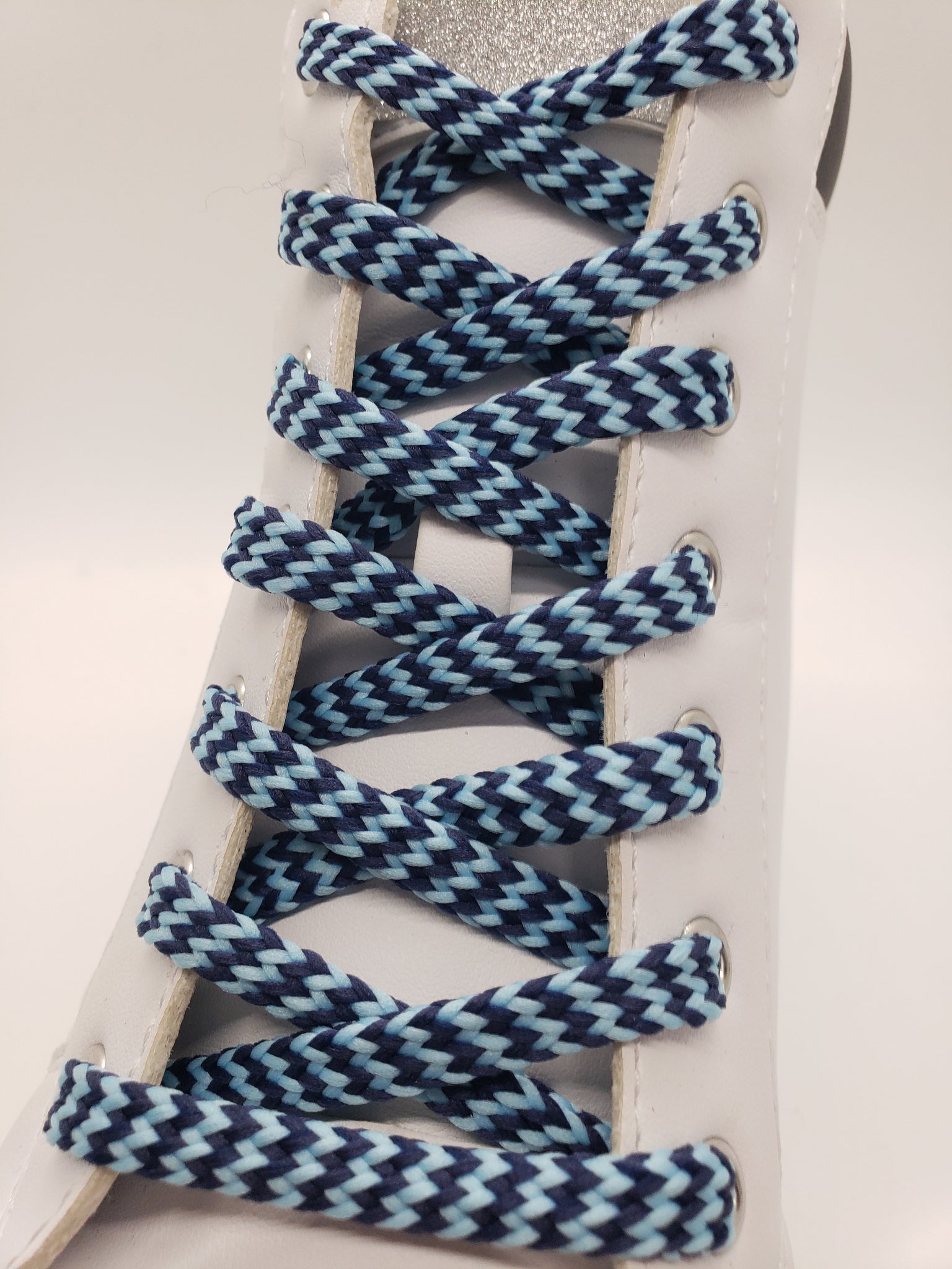 Shoelaces with Light Blue and Royal Blue Chevrons – a classic design that will make your shoes stand out. We call these shoelaces ‘hybrid’ because they are halfway between round and flat. This oval shaped lace is approximately 5/16” wide. Many colors are available but if you don’t see the combination you want feel free to reach out to us.