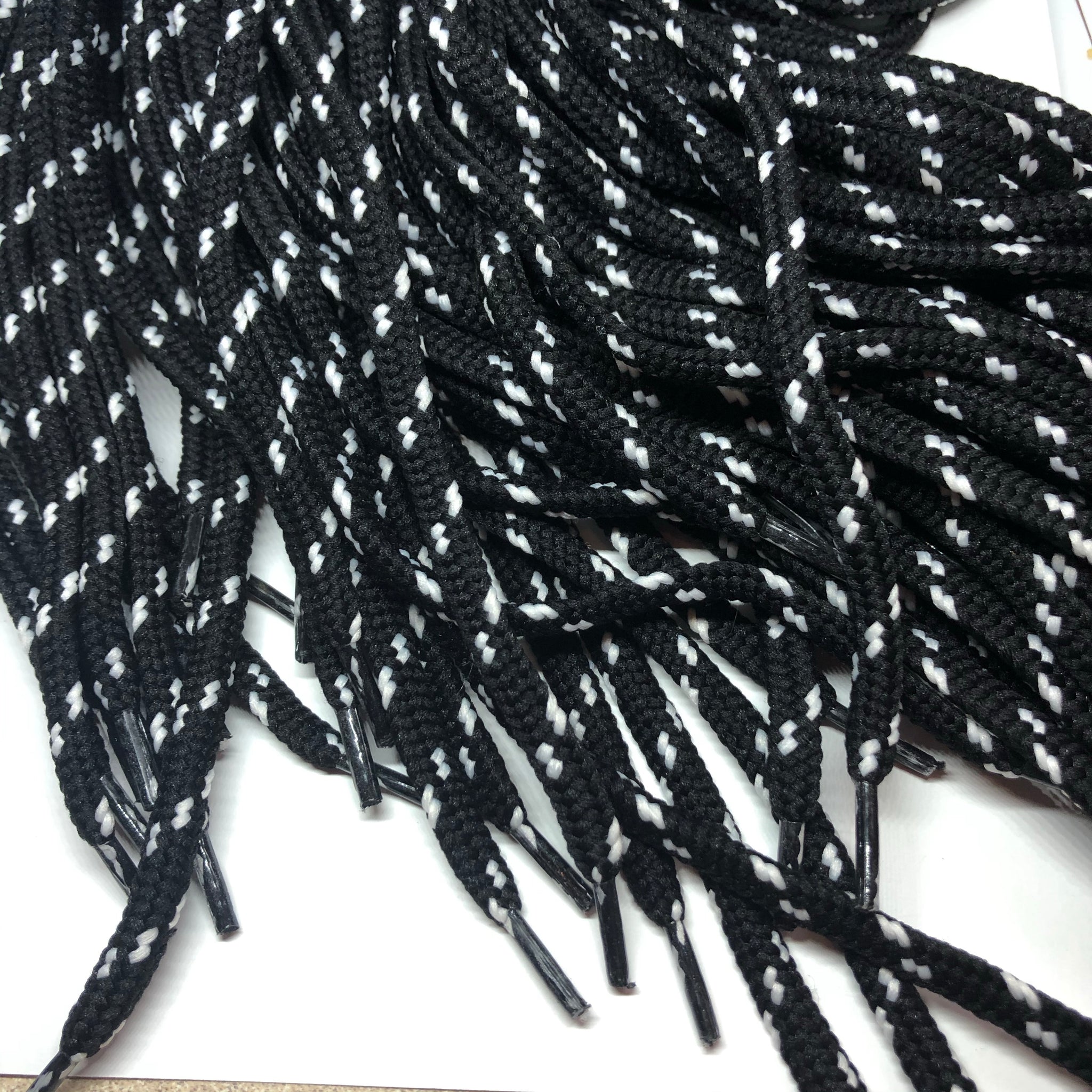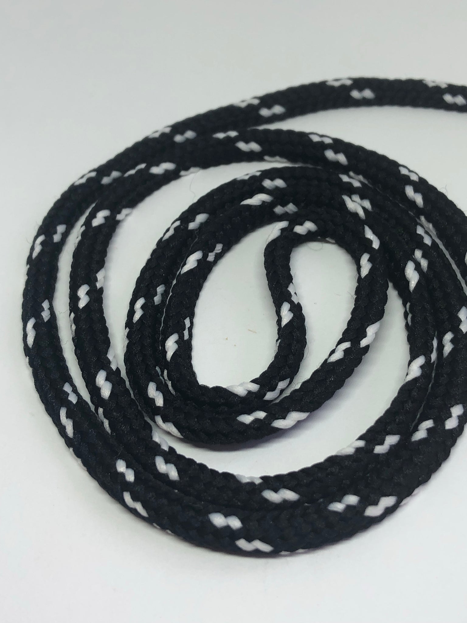 Traditional round laces in Black and White - a classic design that will make your shoes stand out. Round laces work in pretty much all shoes. These laces are made with a filler to provide durability and strength for any application. Approximately 3/16” diameter.