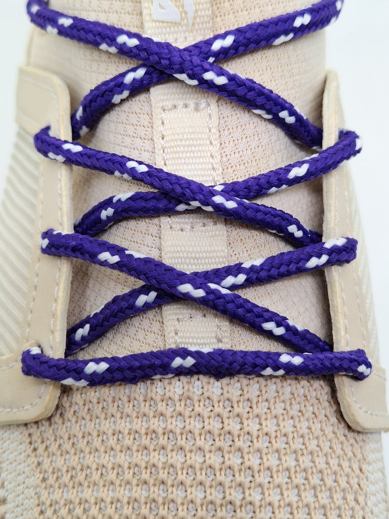 Traditional round laces in Purple and White - a classic design that will make your shoes stand out. Round laces work in pretty much all shoes. These laces are made with a filler to provide durability and strength for any application. Approximately 3/16” diameter.
