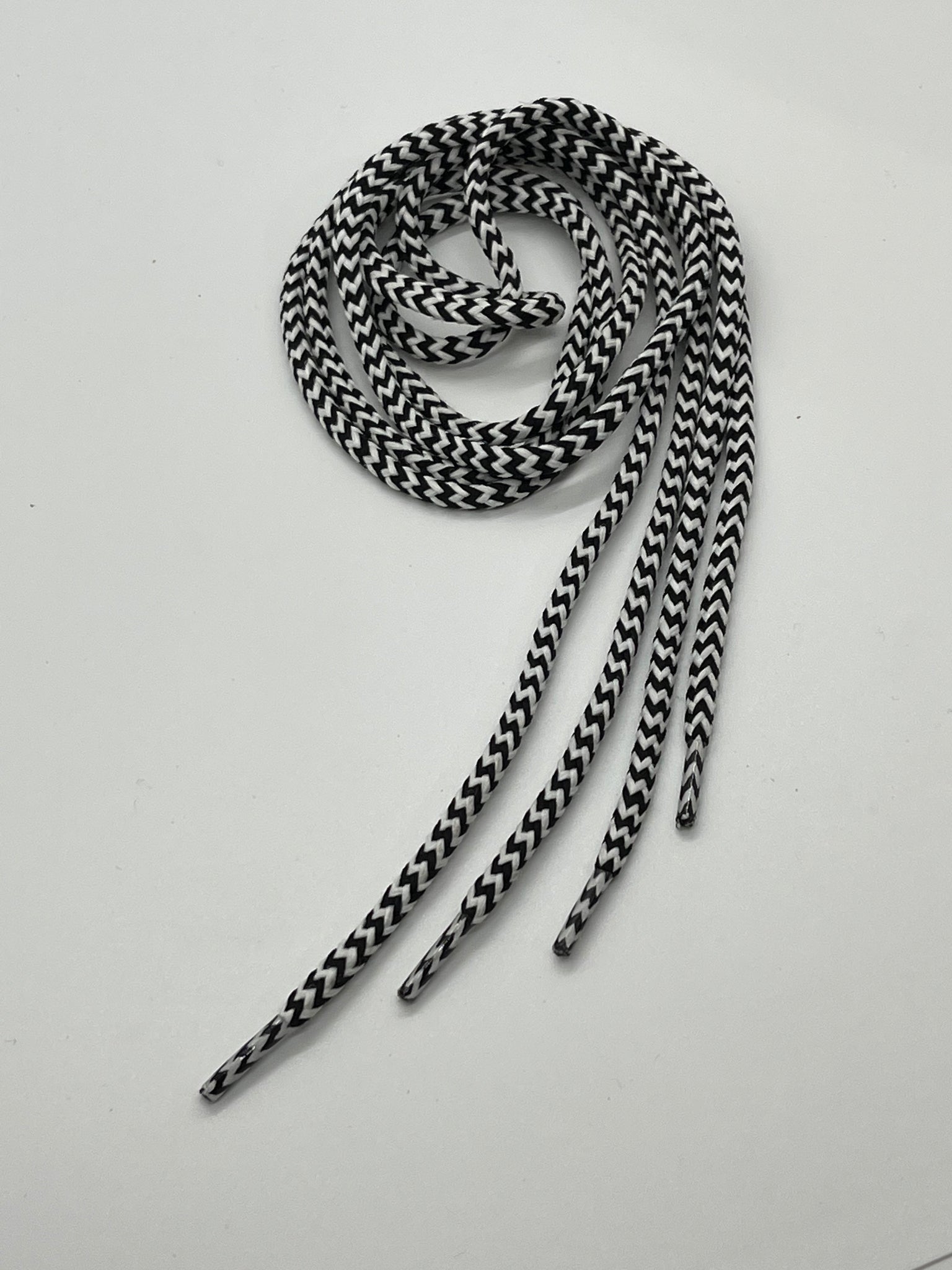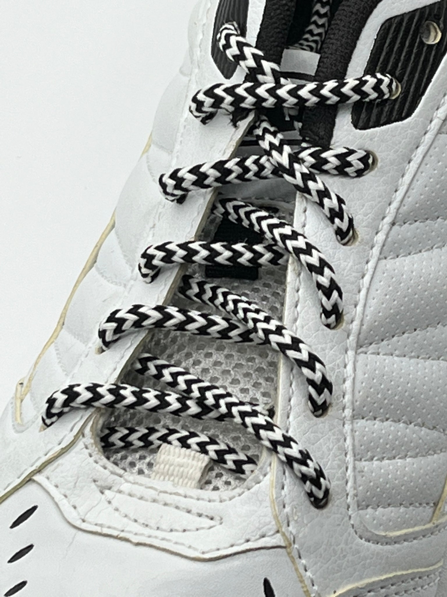 Shoelaces with a chevron pattern in Black and White – a classic design that will make your shoes stand out. Round laces work in pretty much all shoes. These laces are made with a filler to provide durability and strength for any application. Approximately 3/16” diameter.