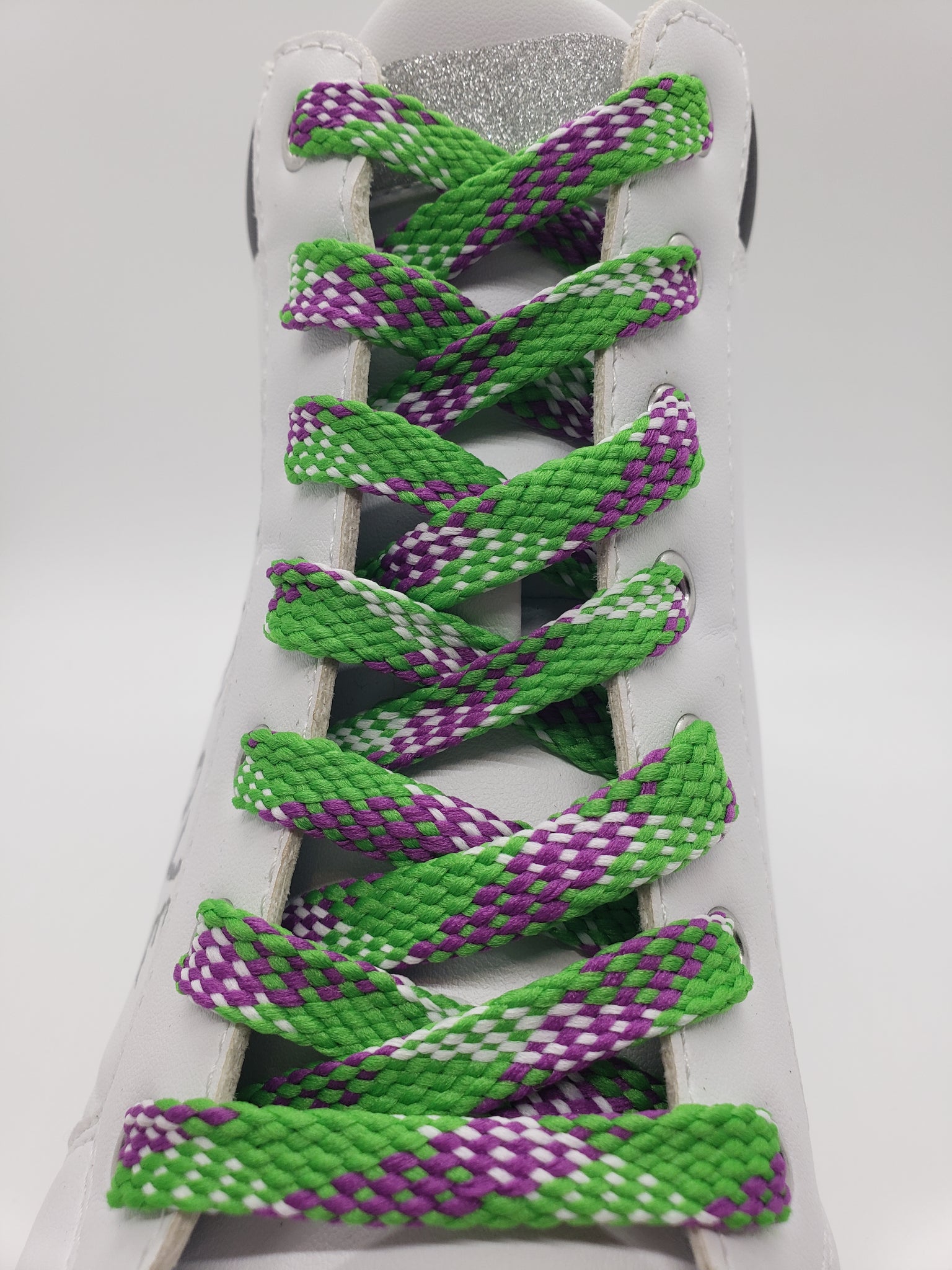 Standard width Plaid shoelaces – a classic design in Green, Purple and White that will make your shoes stand out.  Flat laces that are approximately 3/8” wide. Many colors are available but if you don’t see the combination you want feel free to reach out to us.