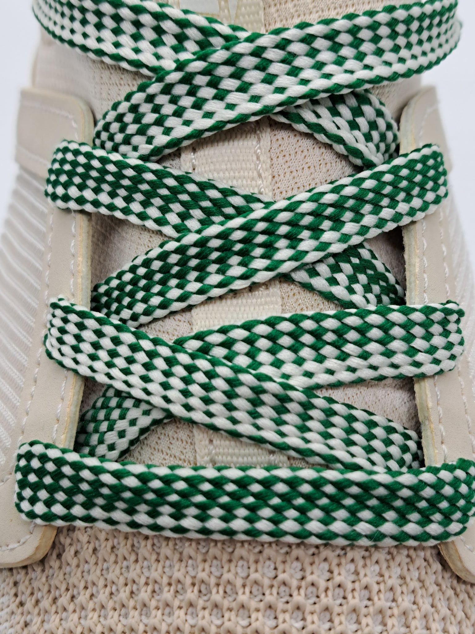 Green and White 50/50 pattern flat shoelaces made with sure-tie technology assuring your shoelaces will stay ties all day long.