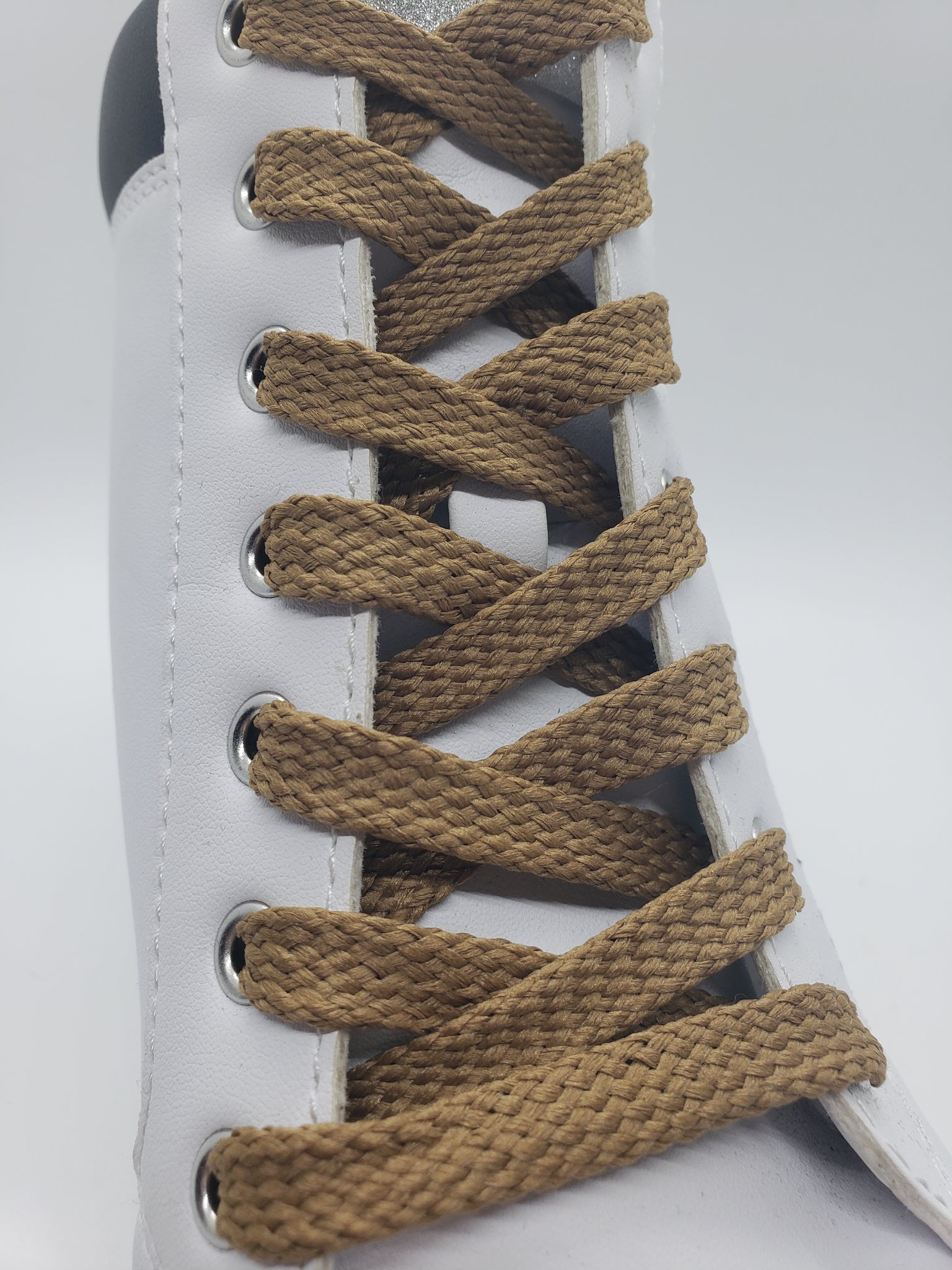 Standard width Light Brown shoelaces – for the understated styles. Flat laces are approximately 3/8” wide. Many colors are available but if you don’t see the combination you want feel free to reach out to us.