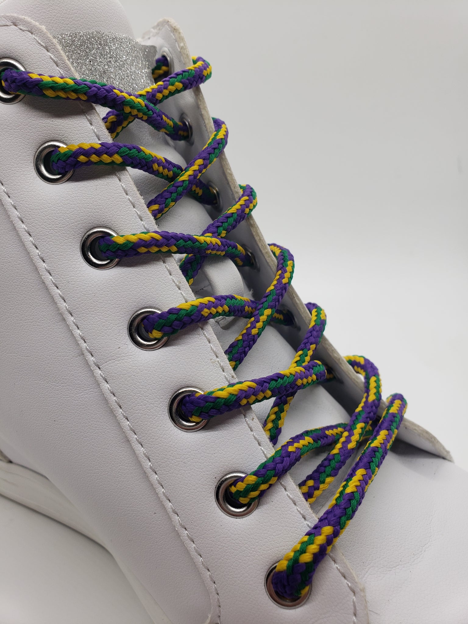 Green, Purple and Gold shoelaces to celebrate a night of excess. Round laces work in pretty much all shoes. These laces are made with a filler to provide durability and strength for any application. Approximately 3/16” diameter.