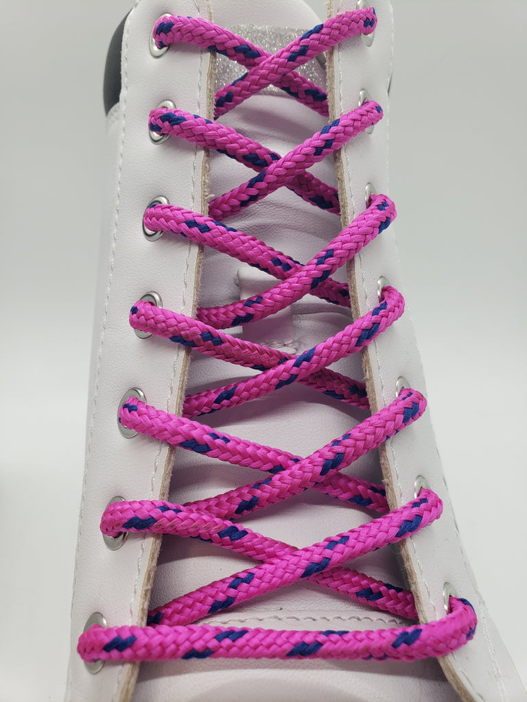 Traditional round laces in Neon Pink and Royal Blue - a classic design that will make your shoes stand out. Round laces work in pretty much all shoes. These laces are made with a filler to provide durability and strength for any application. Approximately 3/16” diameter.