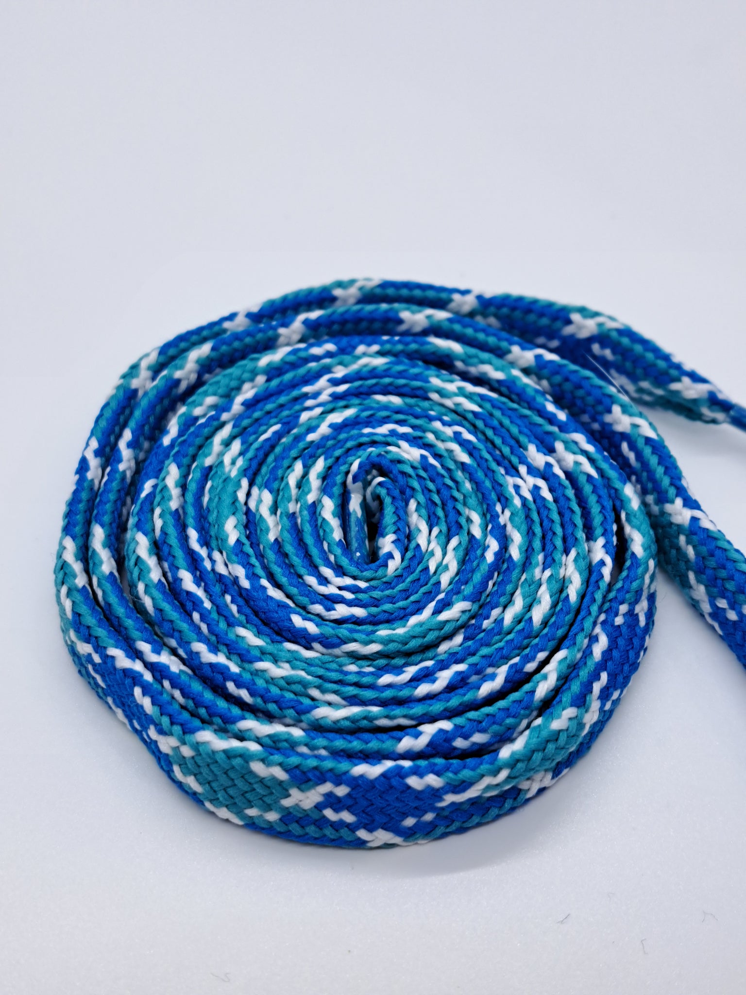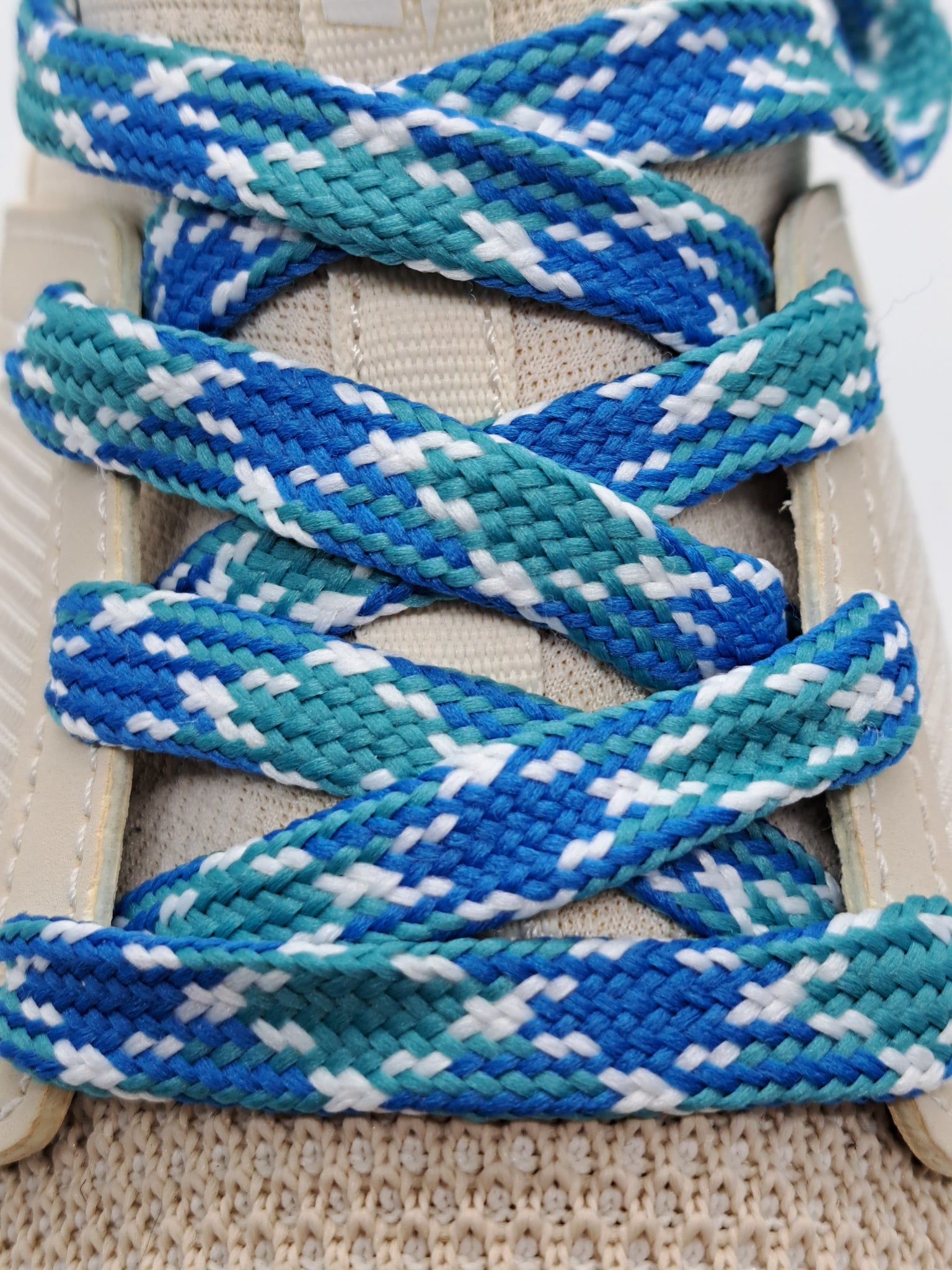 Royal, Teal and White Premium grade sport laces. These high quality laces will look great on your shoes. Show off your team colors or just find the perfect look for your favorite shoes. These laces are flat and approximately ½” wide.