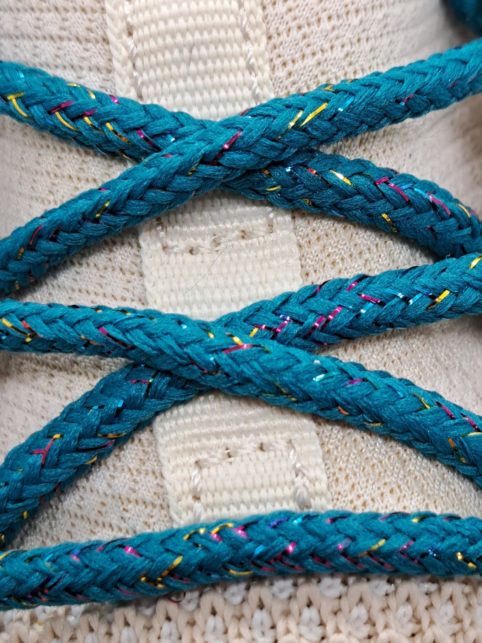 Teal shoelaces with a little extra zing. Our usual Round laces, infused with shimmery yarn. Round laces work in pretty much all shoes. These laces are made with a filler to provide durability and strength for any application. Approximately 3/16” diameter.