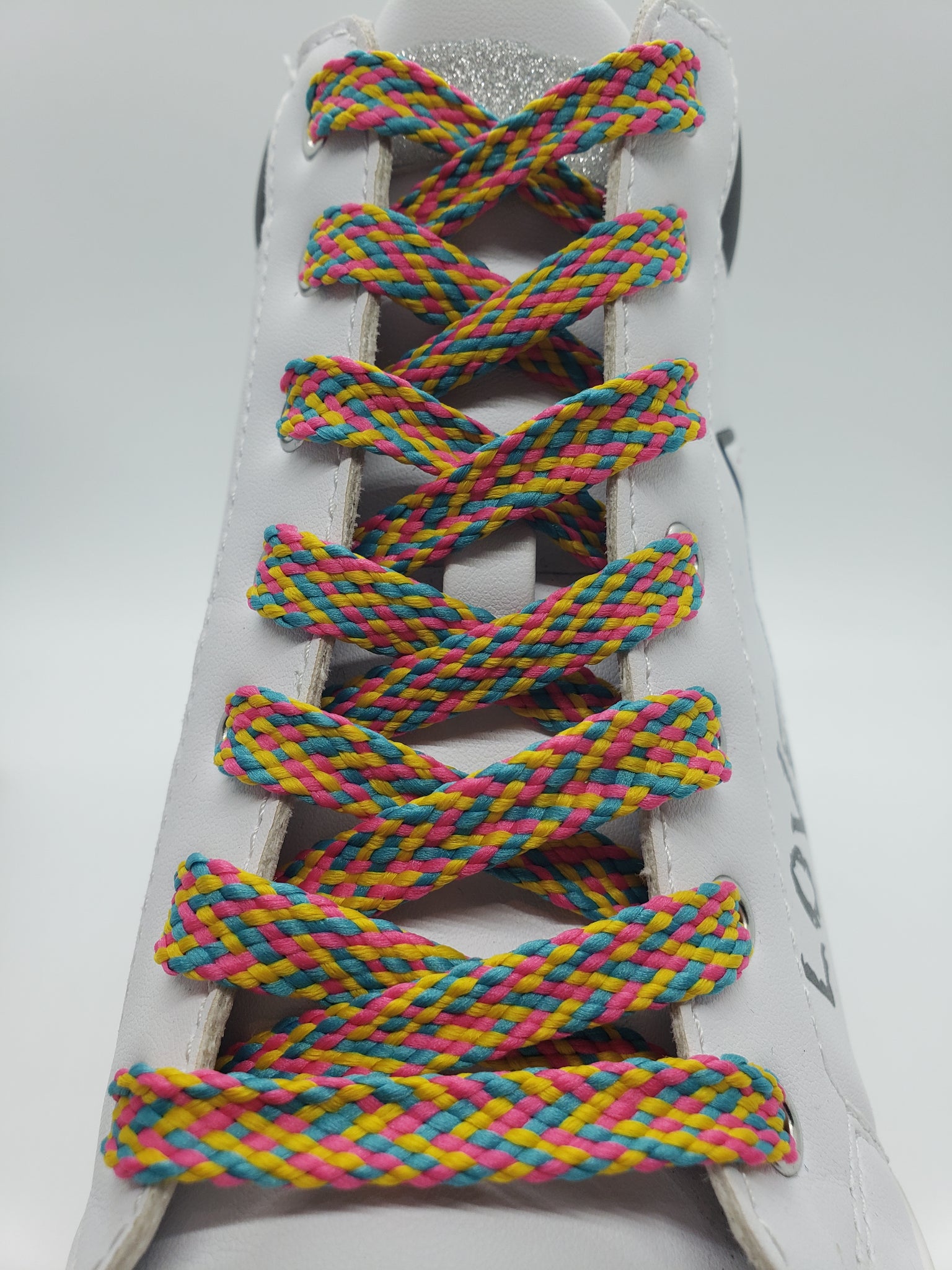 Standard width Confetti pattern shoelaces – Pink, Blue, and yellow combine in this festive lace. Flat laces are approximately 3/8” wide. Many colors are available so if you don’t see the combination you want feel free to reach out to us.