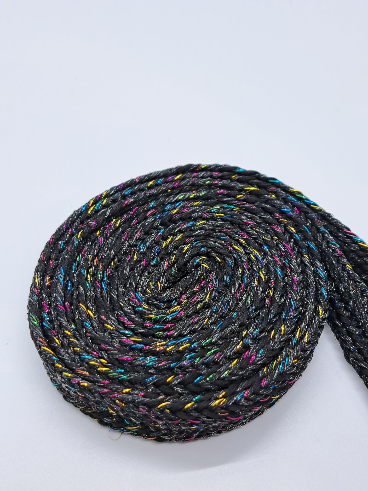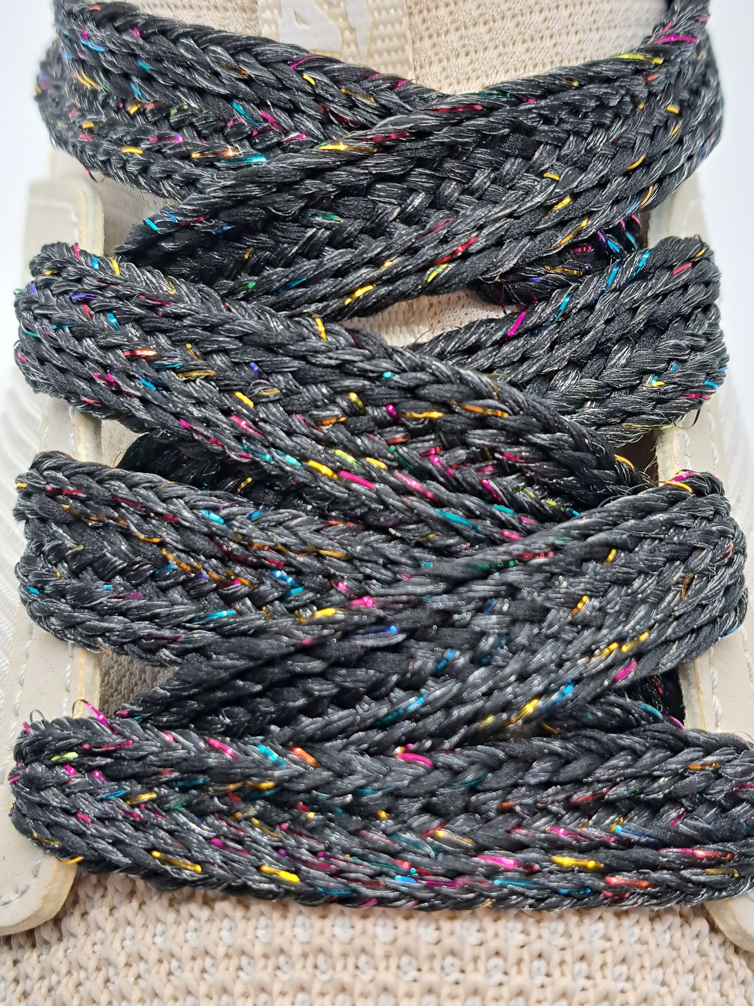 Black and sparkly yarn woven into a fat but flat shoelace design. Wide, flat laces definitely make a statement. Even though they are approximately ¾” wide, these laces will fit in most shoes.