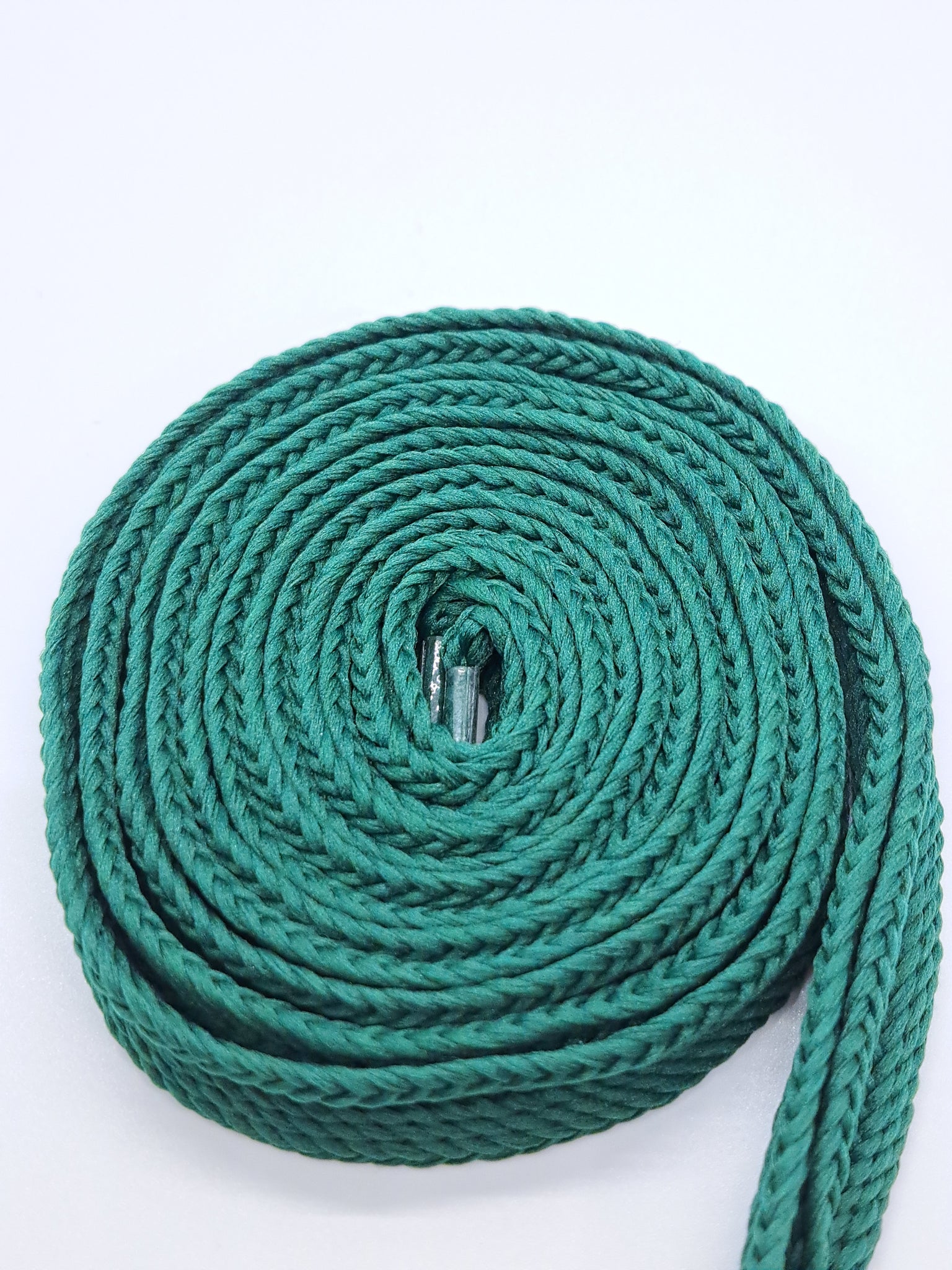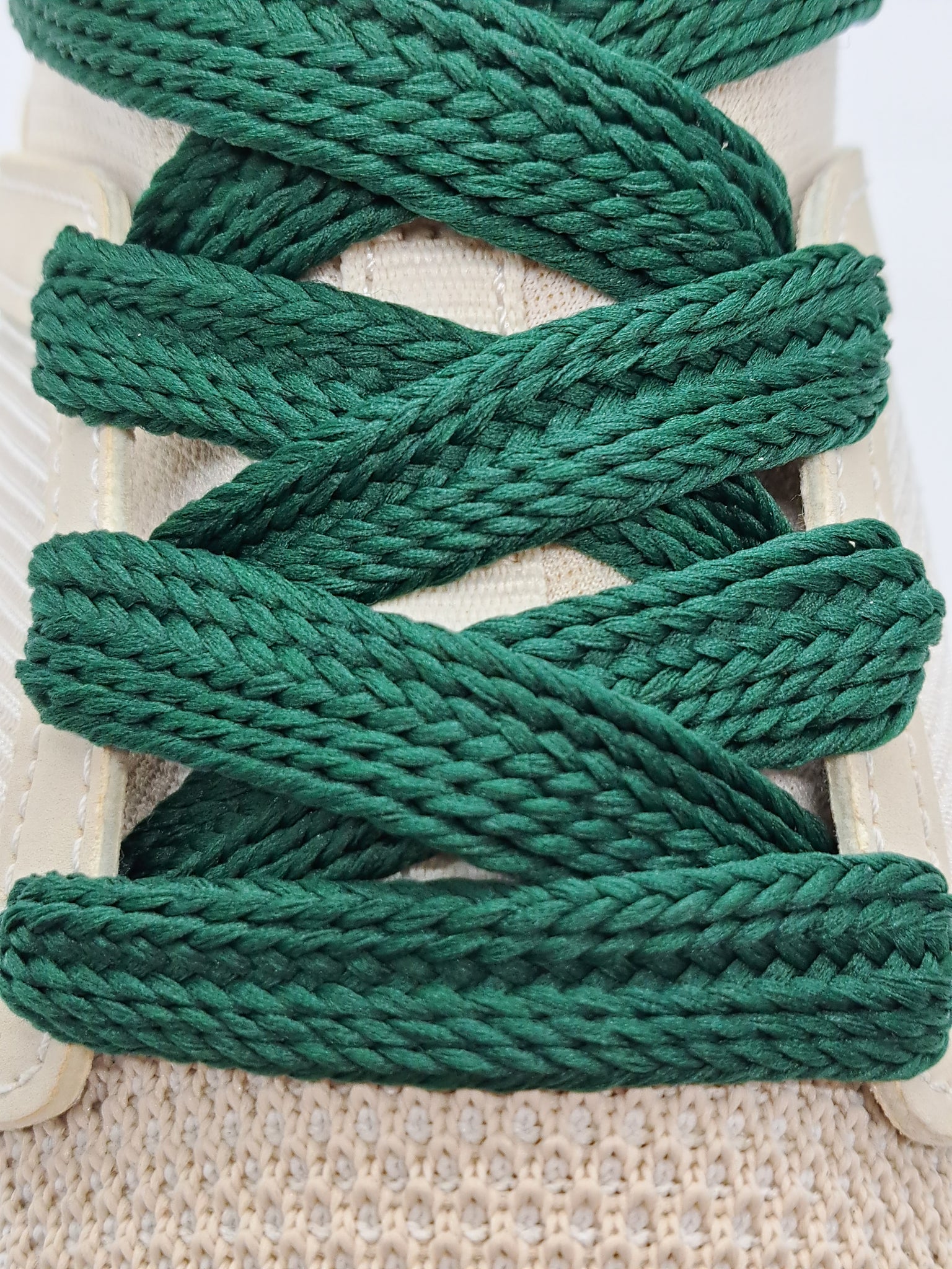 Forest Green yarn woven into a fat but flat shoelace design. Wide, flat laces definitely make a statement. Even though they are approximately ¾” wide, these laces will fit in most shoes.